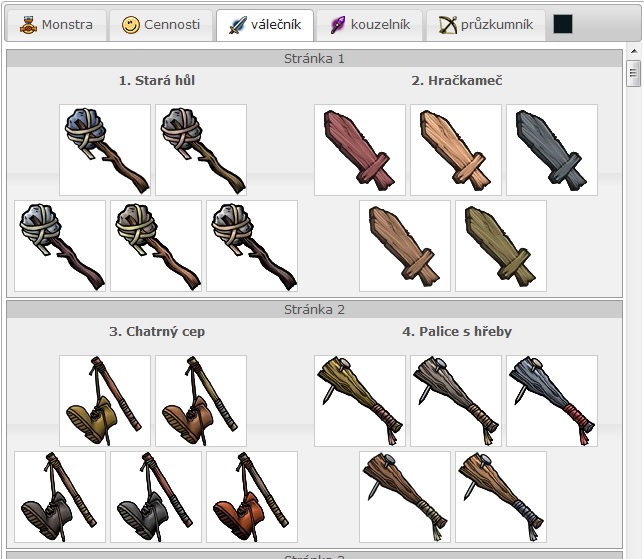 3) Tak a jak jsem na to šel já :-)...jelikož velkou většinu nálepek získáte pouze z malých levlů 1-10 které se vám ukládají vždy na první 2 stránky od každého oblečení , nebo výstroje viz tyto 2 obrázky, to znamená stránky 1,2-11,12-21,22-31,32-41,42...atd pouze válečník má více zbraní, takže u něj str.11,12 jsou pořád ještě zbraně :-) (další dvě stránky např. 3,4 - 23,24 jsou zase z větších levlů cca 10-20 adt)